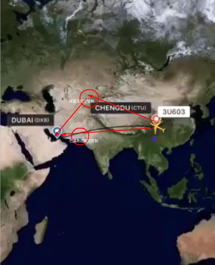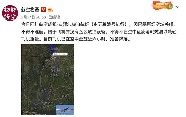 因為印巴局勢緊張,巴基斯坦關閉了領空,影響到了需要飛越巴基斯坦領空從成都到迪拜的四川航空3U603航班。