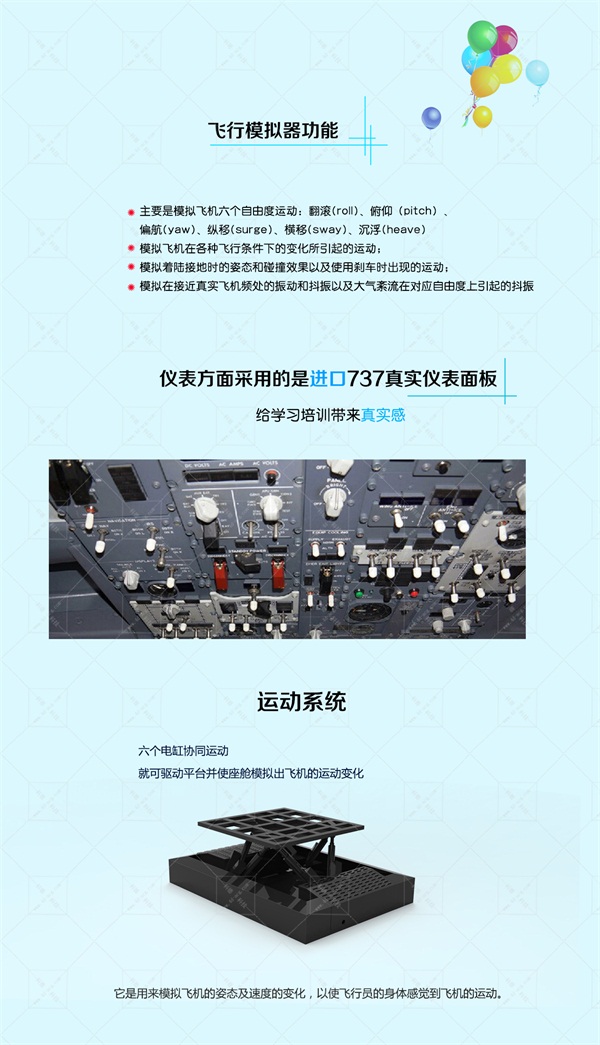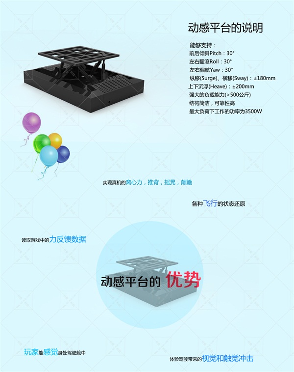 簡介: 全動波音737模擬器-六自由度737飛行模擬器,動感,模擬器能夠支持:前后傾斜Pitch:±20°、左右翻轉Rol:±20°。動感座椅能讀取游戲中的力反饋數據,動態反映到駕駛者身上